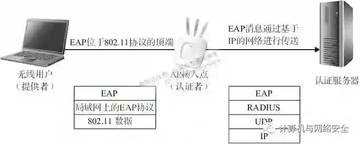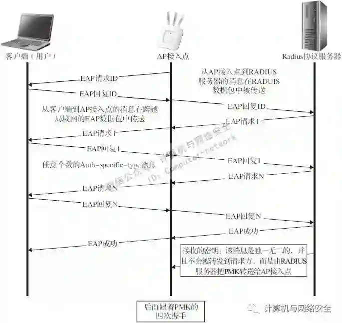 在“WPA企业模式”下,所有的AP接入点所做的事情,就是在客户端和认证服务器(例如RADIUS服务器)之间来回传送EAP信息。并且,AP接入点其实所期待的,也就是RADIUS服务器及时地让它知道是否允许某个用户进入本系统中。而是否允许进入,是通过寻找“EAP成功”的消息,或者是“EAP失败”的消息来判断的。
