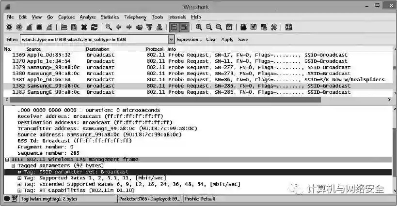 AP接入点每1/10秒发出一次信标数据包。每个数据包包含相同的信息集合,这些信息集合将出现在探测回复数据包中,其内容包括主机名、主机地址、所支持的速率等。因为这些数据包通常可以被任何接收者轻而易举地接收到,所以大多数主动的扫描器也同样可以接收这些数据包并进行处理,然而,事实并非总是如此。通常情况下,主动扫描器可以从网上拿到信标数据包,但并不都是这样,拿不到的情况不仅取决于所使用的扫描器本身,还包括控制无线网卡的驱动程序。主动扫描器的主要缺点是程序界面上除了能看到“探测请求”(和可能的信标)的数据包之外,看不到其他所有的无线通信内容。