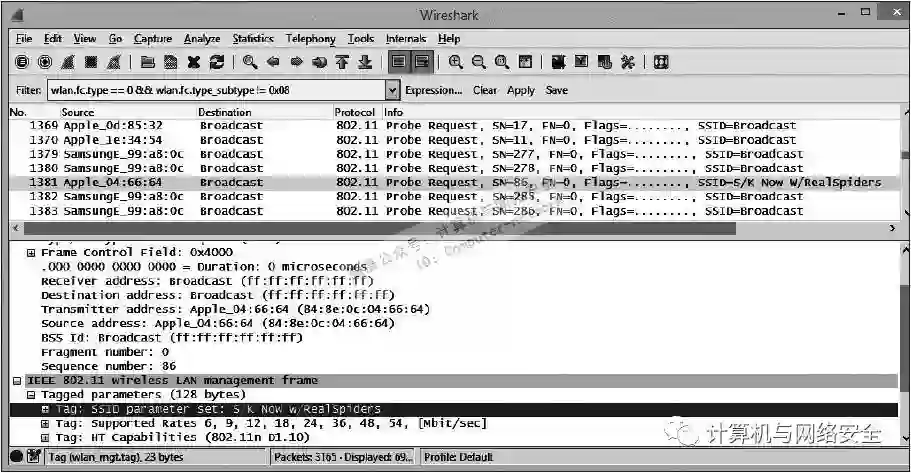 图5 一个探测请求数据包实例(注意其中SSID参数是个广播地址)