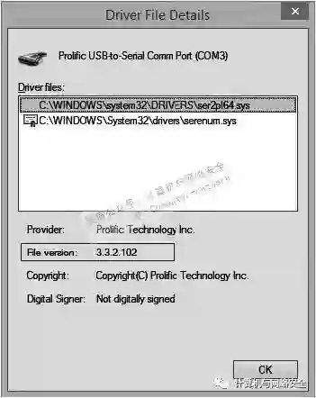 在Windows 7操作系统中,“设备管理器”(Device Manager)会自动检测硬件的变动,并加载正确的驱动程序,以及给该驱动程序分配合适的串口(COM port)。不幸的是,即使在Windows 7上运行很好的驱动程序,在过渡到Windows 8之后,驱动程序中也明文规定禁用BU-353芯片。这个时候,Windows 8的用户(也许叫“受害者”更合适)要想使用这个芯片,只能安装一个旧版本的驱动程序,以便作为一个替代方案。在Windows 8中,BU-353驱动程序的主文件有两个,其中ser2pl.sys用于32位Windows 8中,ser2pl64.sys用于64位的Windows 8中。替代方案详细的方法在网上可以找到。图12显示了一个在64位Windows 8.1操作系统中BU-353驱动的详细信息,注意其中ser2pl64.sys的版本是一个较早的版本号3.3.2.102。