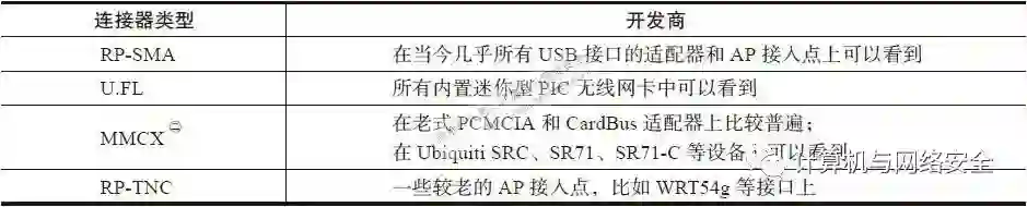 幸运的是,大多数天线与一个特定的连接器相连。这个连接器称为“N型连接器”(N-type connector)。特别需要说明的是,天线端通常是母头的“N型连接器”。这种标准的连接器接口意味着朋友间可以互借天线,而不用担心因为线缆接口和天线接口不是同一类型而无法使用。其他天线连接器类型也不是没有,所以在您假定天线有一个N型连接器之前一定要检查一下。表1详细列出不同连接器的类型,以及其生产商的名称。