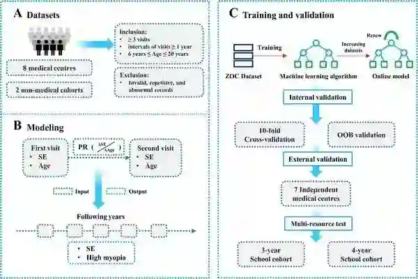 C 我们利用机器学习中的随机森林构建预测模型。中山眼科中心的数据用作测试集,内部验证采用10倍交叉验证及OOB法(out-of-bag)。其余数据及其它合作单位采集数据用以外部验证和多来源测试。