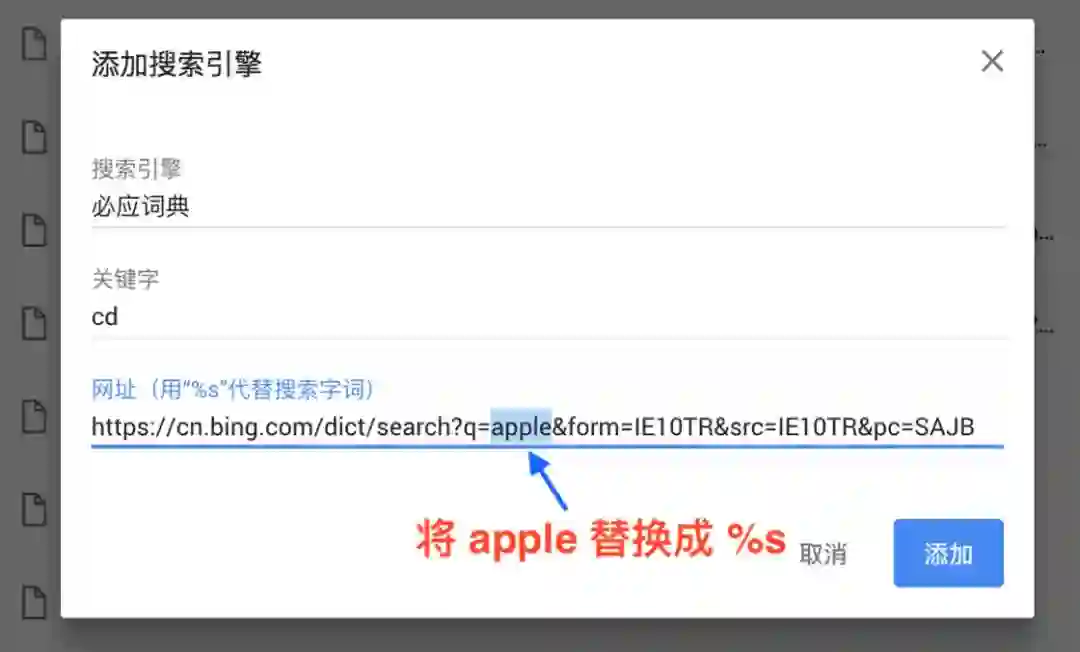 b. 依次进入Chrome 设置 > 管理搜索引擎 > 添加,先自定义一个关键字,然后把刚刚复制的网址粘贴到网址那一栏,将上一步搜索的词汇「apple」替换成 %s。