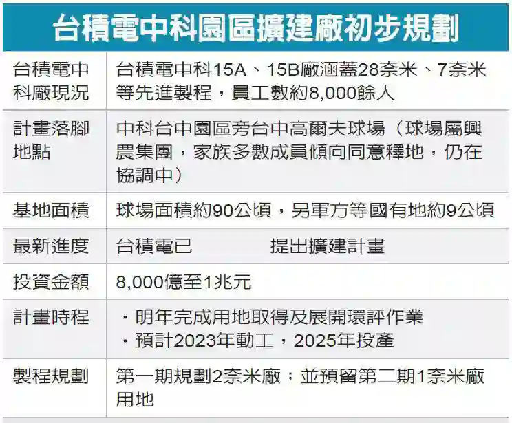 据联合新闻网报道,位于中部科学园区(中科)的新工厂将占用周边的一个高尔夫球场以及部分公有土地。