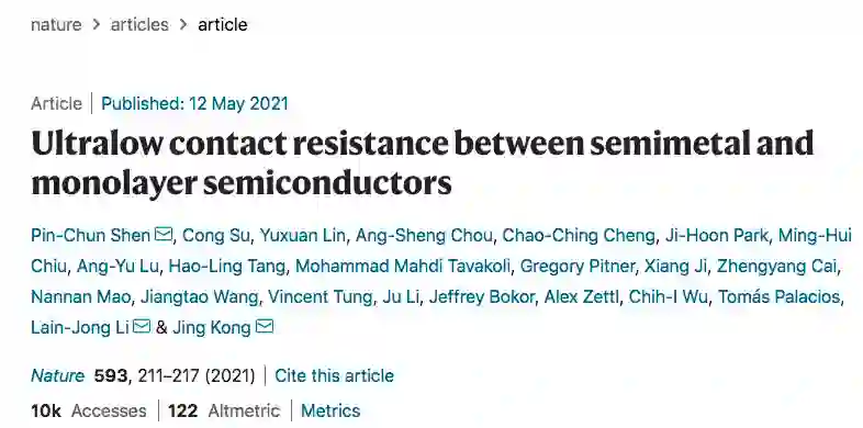 这项研究「Ultralow contact resistance between semimetal and monolayer semiconductors」已发表在Nature期刊上。