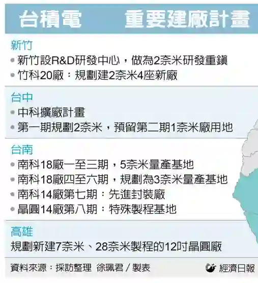 目前台积电在中科的制程涵盖28nm及7nm,由于2nm及1nm制程的设备可以共用,未来将由1.8nm、1.4nm,逐步向1nm推进。