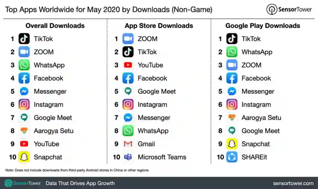 SensorTower数据显示,今年5月份,不论是下载量还是总收入,TikTok都包揽了全球App榜单第一。