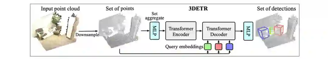 第二个工作3DETR是3D Detection Transformer的缩写。该模型是一种基于Transformer的简单三维检测和分类架构,可作为检测和分类任务的通用三维模型,该模型简化了用于训练3D检测模型的损失函数,更容易实现。它的性能也相当于或超过了依赖于手动调整的3D架构和损耗函数的现有最先进的方法。