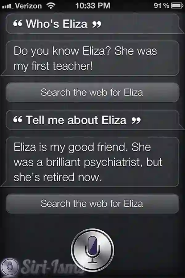 人机对话最早可追溯到 1966 年,麻省理工学院 Joseph Weizenbaum 在 ACM 上发表了题为《 ELIZA,一个研究人机自然语言交流的计算机程序》(ELIZA-a computer program for the study of natural language communication between man and machine)的文章。文章描述了这个叫作 ELIZA 的程序如何使人与计算机在一定程度上进行自然语言对话成为可能。Weizenbaum 开发了最早的聊天机器人 ELIZA,用于在临床治疗中模仿心理医生。ELIZA 的实现技术是通过关键词匹配规则对输入进行分解,而后根据分解规则所对应的重组规则来生成回复。简而言之,就是将输入语句类型化,再翻译成合适的输出。虽然 ELIZA 很简单,但 Weizenbaum 本人对 ELIZA 的表现感到吃惊,随后撰写了《计算机的能力和人类的推理》(Computer Power and Human Reason)这本书,表达他对人工智能的特殊情感。ELIZA 如此出名,以至于 Siri 也说 ELIZA 是一位心理医生,是她的启蒙老师。(“She was my first teacher!”、“…She was a brillant psychiatrist.…”)