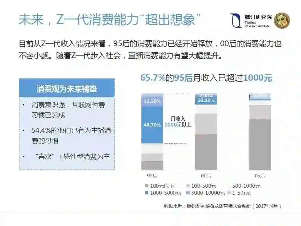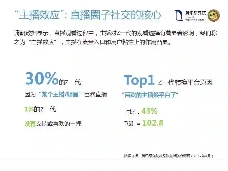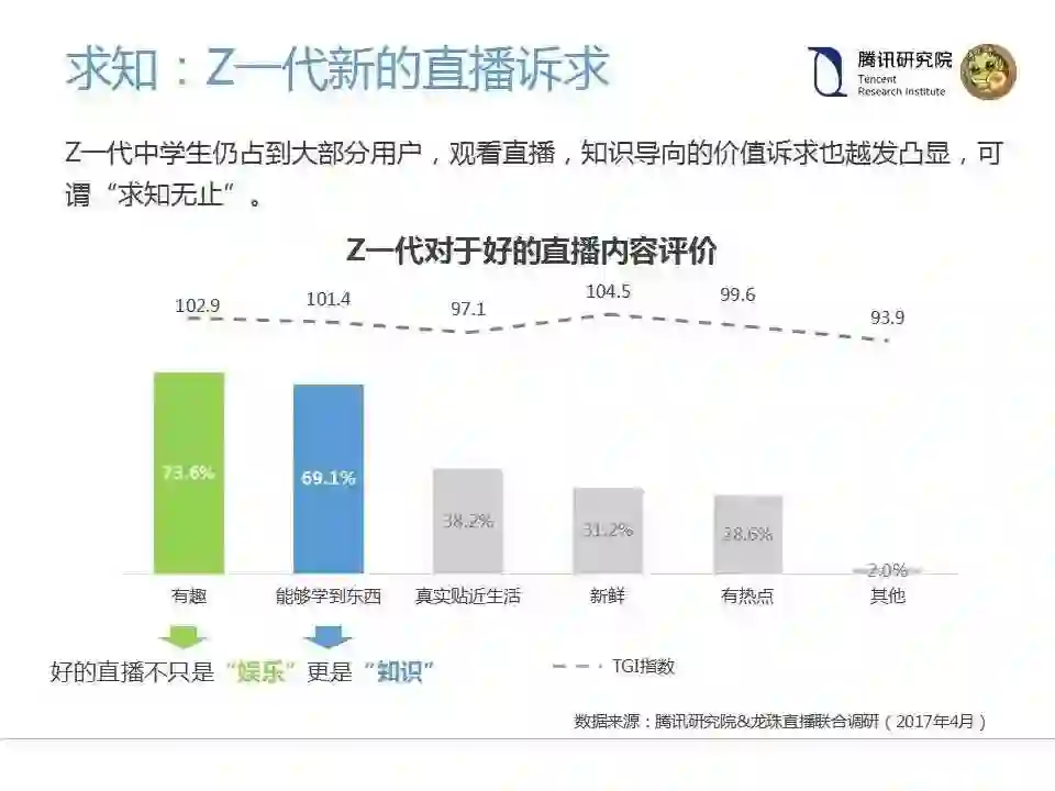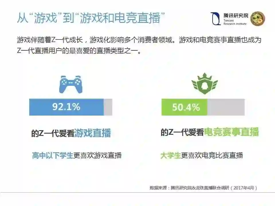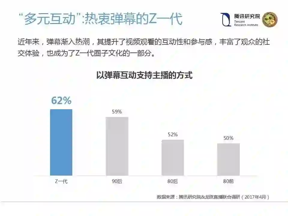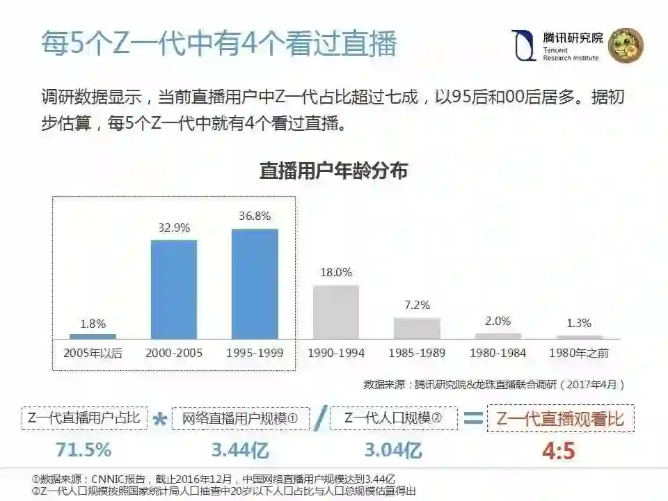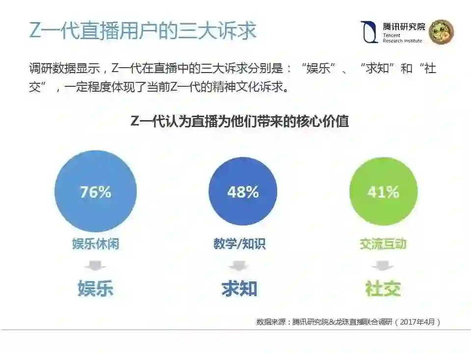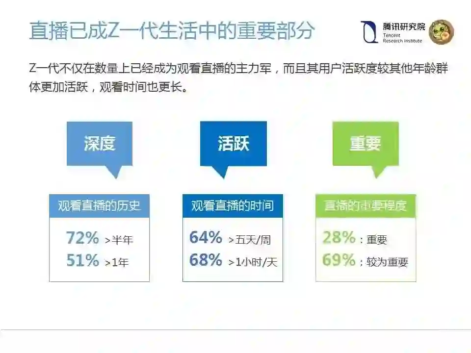 腾讯研究院联合龙珠直播,对9310名直播用户进行调查,描绘出Z一代的直播画像:直播重度用户,娱乐、求知、社交是直播的三大诉求,付费意愿强烈,未来潜力巨大等。并提出了赢得Z一代的直播五大法则。