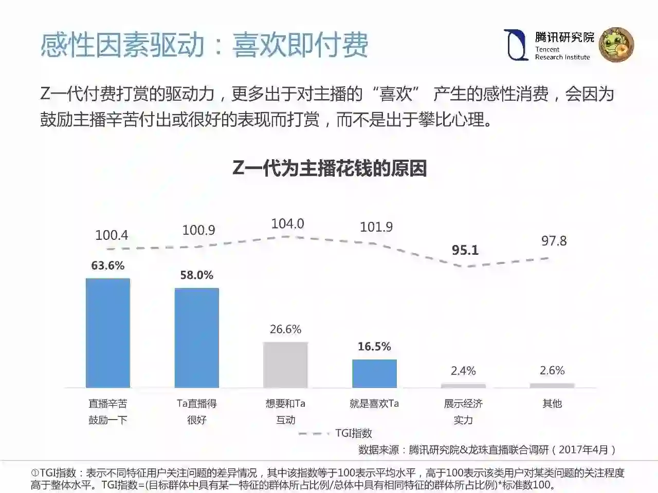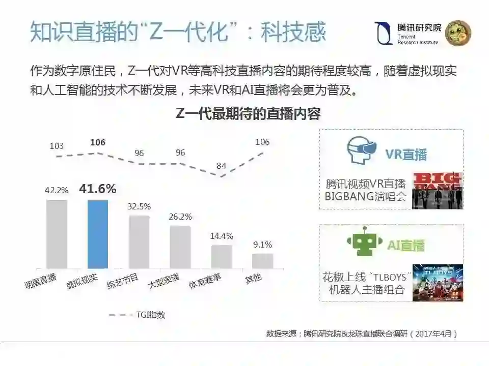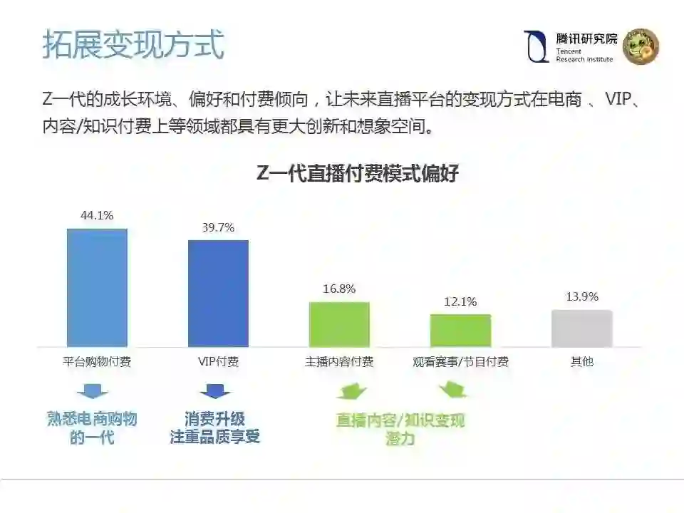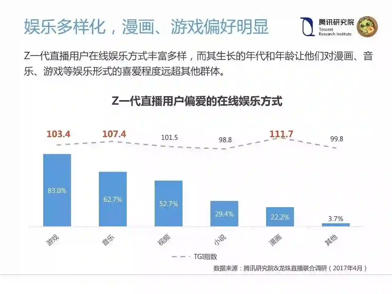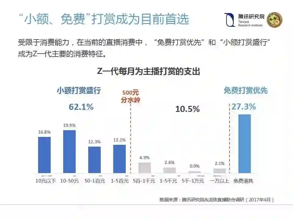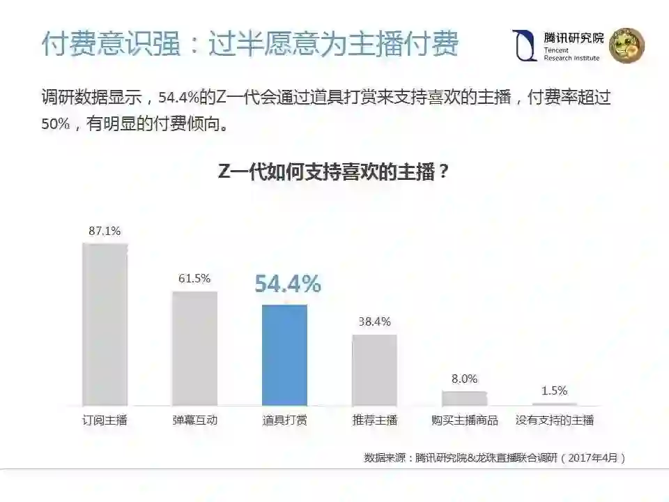 腾讯研究院联合龙珠直播,对9310名直播用户进行调查,描绘出Z一代的直播画像:直播重度用户,娱乐、求知、社交是直播的三大诉求,付费意愿强烈,未来潜力巨大等。并提出了赢得Z一代的直播五大法则。