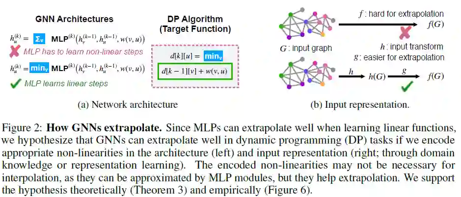 摘要:我们研究了通过梯度下降训练的神经网络如何外推,即它们在训练分布的支持范围之外学到了什么。以前的工作在用神经网络外推时报告了混合的经验结果:虽然多层感知器(MLP)在简单任务中无法很好地推理,但图神经网络(GNN)是带有MLP模块的结构化网络,在较复杂的任务中也有一定的成功。我们提供了理论上的解释,并确定了MLP和GNN良好推断的条件。我们首先显示受梯度下降训练的ReLU MLP沿原点的任何方向迅速收敛到线性函数,这表明ReLU MLP无法在大多数非线性任务中很好地推断。另一方面,当训练分布足够“多样化”时,ReLU MLP可以证明收敛到线性目标函数。这些观察结果得出一个假设:如果我们在体系结构和输入表示中编码适当的非线性,则GNN可以很好地推断出动态编程(DP)任务。我们为该假设提供理论和经验支持。我们的理论解释了先前的外推法成功并提出了其局限性:成功的外推法依赖于结合特定于任务的非线性,这通常需要领域知识或广泛的模型搜索。