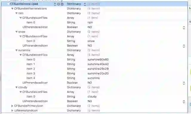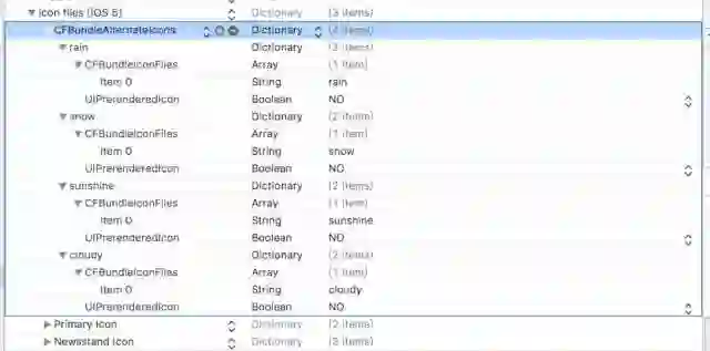 在 Icon files(iOS 5)内添加一个Key: CFBundleAlternateIcons ,类型为字典,在这个字典里配置我们所有需要动态修改的icon:键为icon的名称,值为一个字典(这个字典里包含两个键:CFBundleIconFiles,其值类型为Array,内容为icon的名称;UIPrerenderedIcon,其值类型为bool,内容为NO,也可以不加此key),例如: