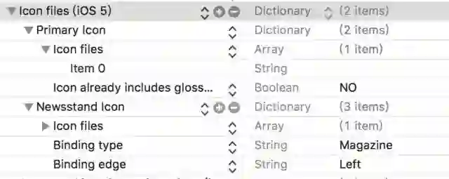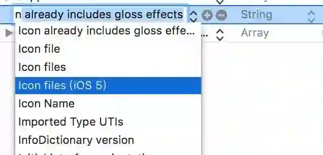 这里的Icon files(iOS 5)是个字典,其中可包含的Key值有CFBundlePrimaryIcon -> Primary Icon