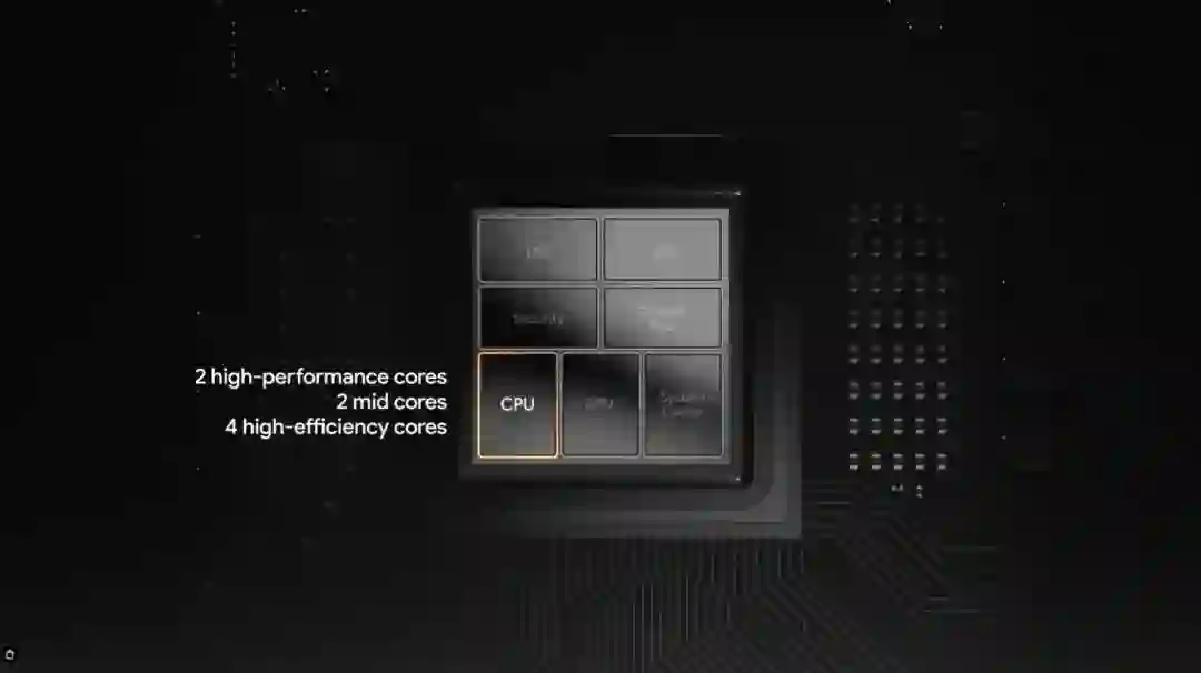 谷歌 Tensor 基于三星工艺打造,集成 8 核心 CPU,包含 2 颗 Cortex-X1 超大核心、2 颗 Cortex-A76 大核心、4 颗低功耗能效核心(应为 Cortex-A55),GPU 则为 20 核心。