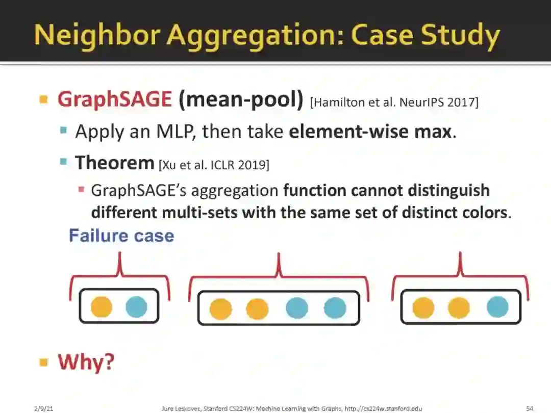 作者表明,在区别不同图结构时,GNNs最多只能取得和 WL test 一样效果,即,GNNs表征能力的上限是WL test;