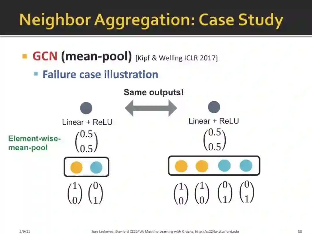 给出了GCN和GraphSAGE等传统图网络框架不能区分的网络结构;