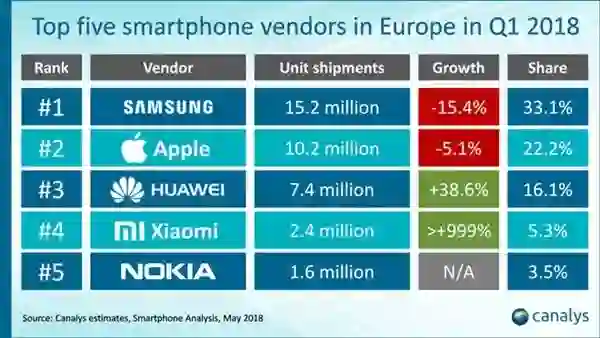 市场调研机构Canalys送出最新统计显示,在欧洲市场苹果第一季度依然是大赢家,因为他们收获了不错的市场份额,而iPhone X则是欧洲最卖座的智能手机。
