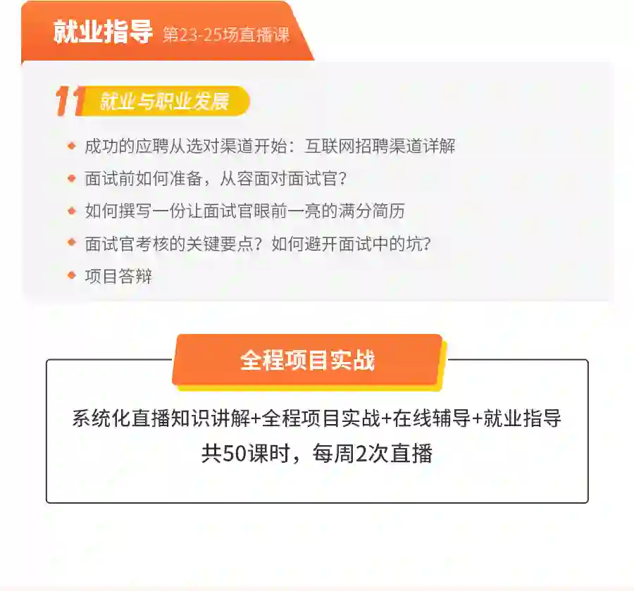 在课程的最后,我们也会给大家做好就业辅导。这部分内容包括如何找工作、如何撰写简历、如何让自己拿到更多内推机会以及如何做好职业规划等等,已经全部打包放在课程中啦,就等你来学!