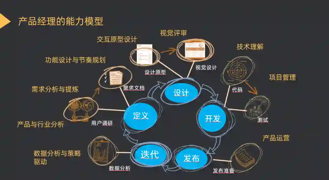 再者就是学习这个工作所需的知识和技能。这里强调一下,产品经理的工作并非是只负责一个项目的某一个模块,而是负责跟进项目的整个流程: