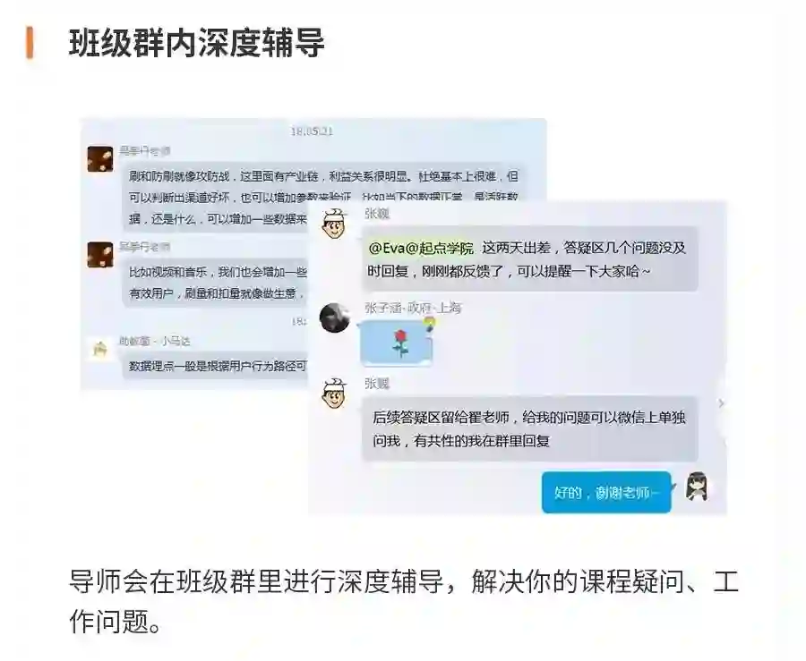 如果担心课堂上学习得不够透彻,在课后导师还会留在班级群中为学员们进行专属答疑,帮助学员解决从学习到工作上的问题。