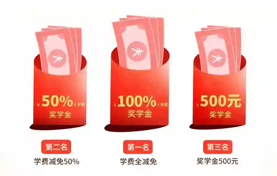 我们还为优秀学员准备了奖励:在课程结束时,我们会以本学期总成绩为准,给前三名同学颁发奖学金,第三名获得500元,第二名学费减免50%,第一名学费全减免!