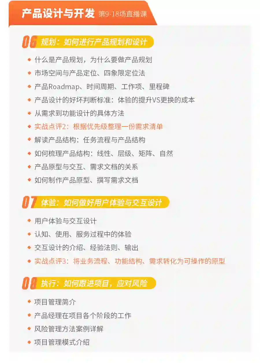 所以,这门课程涵盖了大厂产品经理成长体系以及产品经理实际技能应用,系统地覆盖了产品知识核心6大板块,帮助大家进行体系化地进阶学习。