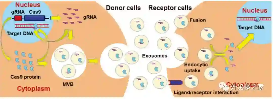 CRISPR/ Cas9系统具有临床应用前景,但是缺乏安全有效的传递系统是一个问题。目前,CRISPR / Cas9系统通常是通过体内病毒载体递送,比如慢病毒载体、腺病毒载体和腺相关病毒(AAV)载体。然而,病毒载体的可能的细胞毒性、免疫原性和长期表达仍然是临床应用的障碍。最近,一些非病毒传递方法正在开发中,如脂质样纳米粒子、Cas9蛋白/gRNA核糖核蛋白复合物,但它们的稳定性、安全性和效率有限。外泌体是一种纳米级细胞外脂质双层囊泡,直径30 -150nm,广泛用于治疗和诊断应用。例如,肿瘤来源的外泌体在体外通过电穿孔的方式包装CRISPR / Cas9表达质粒,用作CRISPR / Cas9系统的载体。此外,一种脂质体杂交外泌体,所得到的杂合纳米粒子可以有效地将大的CRISPR / Cas9表达质粒包封并递送到靶细胞中。然而,使用CRISPR /Cas9表达质粒通常在靶细胞中对基因组DNA片段的整合出现非特异性编辑。为了更安全地使用CRISRPR / Cas9系统,一些研究报道了使用细胞外囊泡来递送Cas9 /gRNA复合物。例如,通过将Cas9蛋白与ARRDC1连接形成ARRDC1介导的微泡(ARMMs),以及通过用水泡性口炎病毒(VSV-G)的糖蛋白修饰供体细胞形成的携带RNPs的囊泡(VEsiCas),通过这些手段可以模拟病毒感染过程。此外,脱靶效应对CRISPR /Cas9系统的临床应用提出了另一个主要挑战。幸运的是,高保真Cas9(SpCas9-HF1)、增强特异性Cas9(eSpCas9(1.1))和超精确Cas9(HypaCas9)蛋白突变体可以显著减少的脱靶切割。所以用于临床实践的CRISPR /Cas9系统还需要更多的努力。