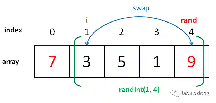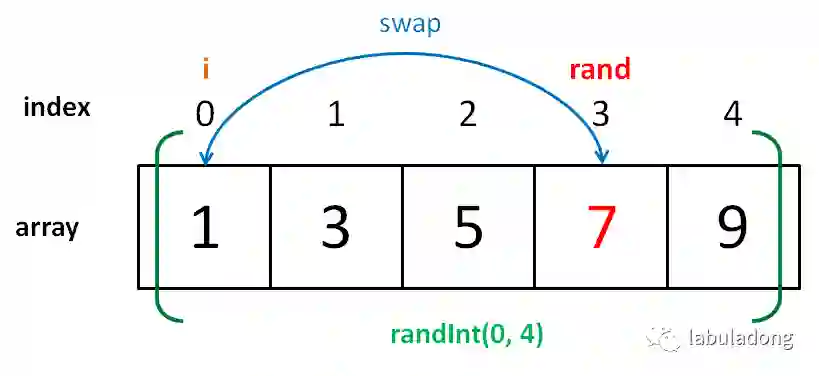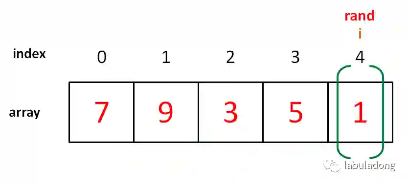 后面以此类推,直到最后一次迭代,i=4,rand 的取值范围是 [4,4],只有 1 个可能的取值。