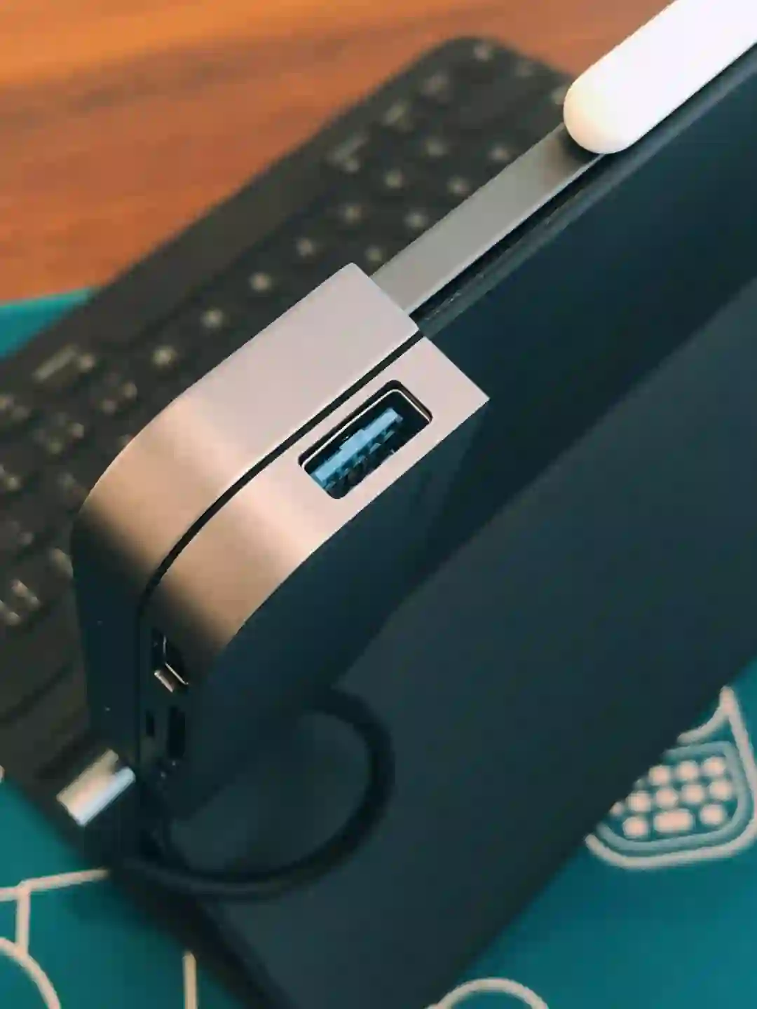 大家可以从实际需求出发,比如最常用到的功能可能只有读取 SD 卡、U 盘和充电功能,HDMI 输出之类的功能几乎不用,那么就可以在选购时挑选接口少一点的扩展坞。为了避免出现横屏使用 iPad 时扩展坞垂在空中的情况,一些厂商也专门推出了适配 iPad 的扩展坞,插上之后可以把扩展坞卡在屏幕边缘固定。但是选择这种扩展坞时大家需要注意,虽然 iPad Air 和 iPad Pro 长得很像,但是前者比后者厚了 0.2mm,所以如果要购买为 iPad 设计的异形扩展坞,最好弄清兼容性问题。