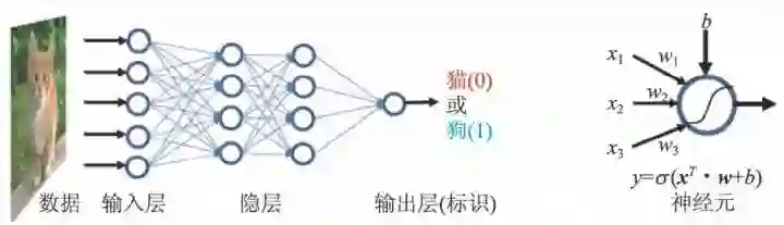下面我们通过一个图像识别的例子,来说明神经网络的工作原理和该方法与传统算法的区别。假设有大量关于猫和狗的不同照片,我们希望编写程序来让计算机对这些图片进行分类。在传统的逻辑编程中,程序员自身必须知道猫和狗照片的本质区别,并将其精确地翻译成计算机语言,对每张输入图片进行“if…,then…”的逻辑判断,输出结果。不幸的是,对这样一类问题,这种传统的编程方法一般很难成功。一方面由于区分“猫和狗照片的本质区别”的精确判据可能很难找到,甚至根本不存在(对每一条判定标准,人们往往都可以找到反例)。另一方面,输入的图片可能有无穷多种可能性,程序员很难穷举出所有可能出现的情况。人工神经网络方法针对这类问题,提供了一种新的解决问题的思路。人们将一部分具有正确标识的图片输入网络,并将网络预言的标识和正确标识做比较,通过动态调节网络参数(神经元间的连接强度和神经元的偏置),不断提高网络预言标识的准确率,最终完成从图片到标识这一函数拟合。在训练过程中,机器自动提取了很多区别猫和狗图像的重要特征,尽管其中单个的特征作为判定标准(例如猫头的形状一般比狗更圆),可能不够精确,但是机器会根据训练结果,自动地将提取出的特征做出综合权衡,并将它们以某种形式储存到网络参数中,最终形成自己的判定标准并以此对标识未知的新图片进行判断,最终我们认为机器通过训练“学会”了区分猫和狗的图片。从这个例子中,我们可以看到机器学习方法的一些特点:(1)该算法适用于处理很复杂甚至定义比较模糊的问题,这些问题往往超越了传统的穷举法和逻辑编程方法的处理能力;(2)在这一算法中,程序员本身不需要知道猫和狗的本质区别在哪里,所有这些区别或判定标准都是机器在训练过程中自动涌现的;(3)它是一种启发性的近似算法,通过牺牲一定的精确性来提高算法的效率,但不能保证预言结果百分之百准确;(4)在多数情况下,没有普适标准来保证该方法的成功率和效率,在很多具体问题中,人工神经网络的设计高度依赖于程序员的经验和直觉。