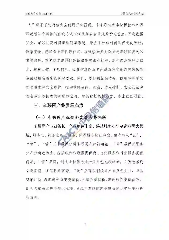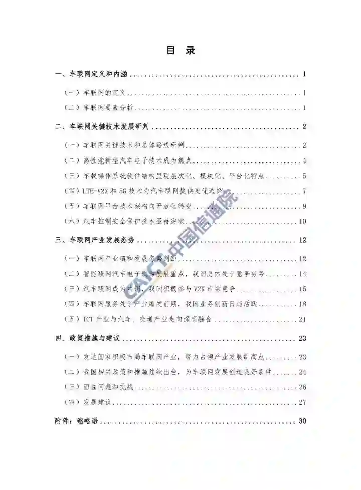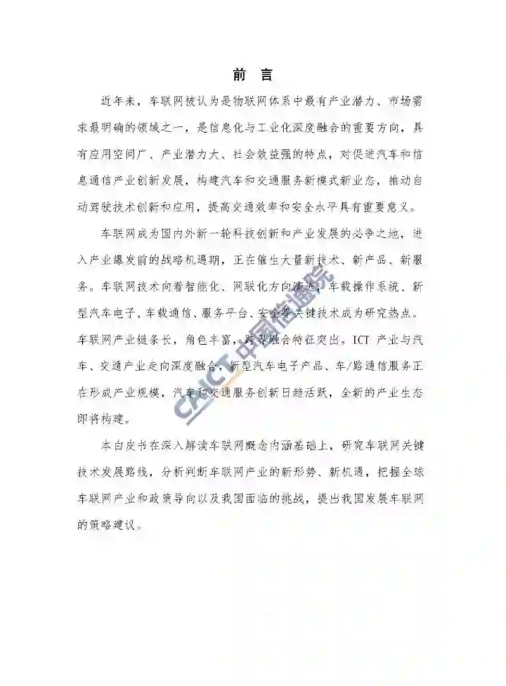 本白皮书在深入解读车联网概念内涵基础上,研究车联网关键技术发展路线,分析判断车联网产业的新形势、新机遇,把握全球车联网产业和政策导向以及我国面临的挑战,提出我国发展车联网的策略建议。(如需下载全文,请在评论区留下您的邮箱)