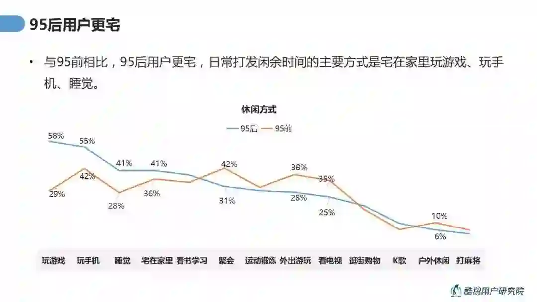 崇尚“宅”文化的95后,宅在家里打游戏、看视频、睡觉是他们普遍的放松与娱乐方式。在内容追求上以“娱乐至上”“兴趣导向”为宗旨,对于正经严肃的内容95后并不买单。