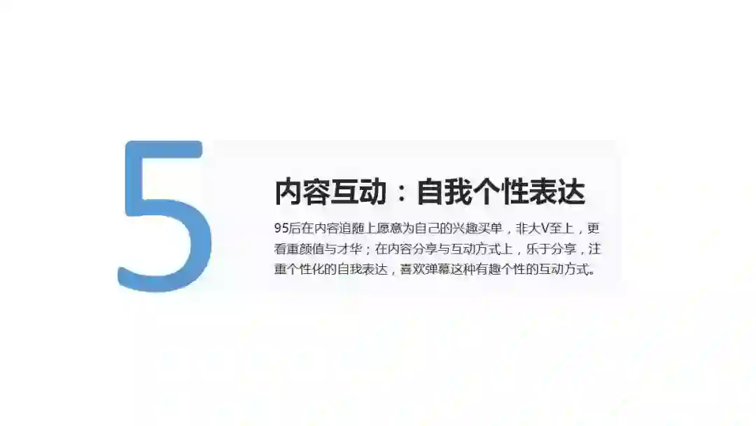95后在内容追随上愿意为自己的兴趣买单,非大V至上,更看重颜值与才华;乐于分享,注重个性化的自我表达,喜欢弹幕这种有趣个性的互动方式。