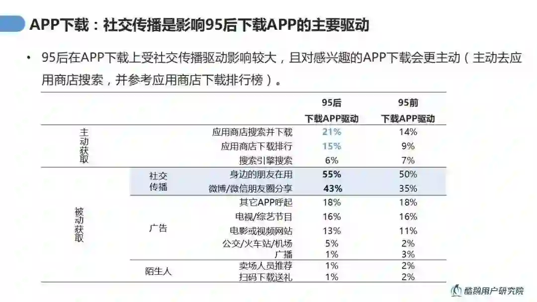 95后用户每天使用的APP中最高频的是社交类应用,社交媒体是95后获取感兴趣内容的主要渠道,内容获取社交化,社交传播的影响对于95后用户下载新的APP起关键作用。