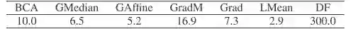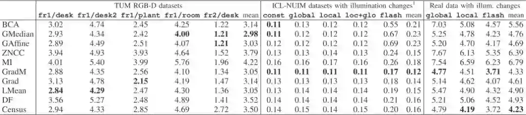 针对视觉里程计的评估结果见表4,平均值见图3右图。在TUM数据集上,基本的BCA算法表现良好,GMedian方法性能最好。GradM方法在合成数据集上的结果最好。但是在真实的数据中,Census表现地最好。