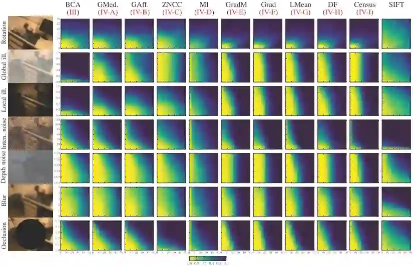 在该评估中,作者生成许多图像对并将其劣质化(平移、旋转、全局和局部的光照变化、亮度和深度噪声、模糊和遮挡),以评估上述算法的收敛概率。结果见图5,将收敛概率映射为了颜色。该实验中最重要的一点是:BCA在小的、瞬间的光照变化下都失败了。GAffine只展现了一部分对全局变化的鲁棒性,MI表现不佳,所有基于梯度的方法都类似。