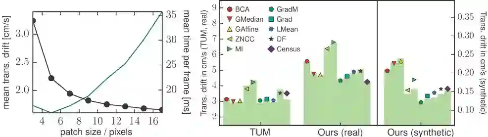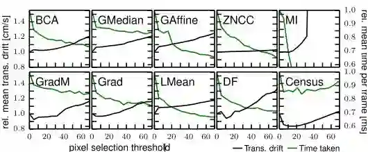 对于深度图,作者设定一个灰度梯度阈值,低于该值的像素会被丢弃。该阈值的选择以最小化漂移为准。平移漂移的相对变化和每帧的处理时间见图4。