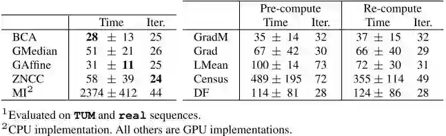 基于描述符的算法可以预先计算或是在优化中的每回迭代中进行重新计算,对这两种方法的评估见表3。可以看出重新计算总是比预先计算的漂移小,对基于梯度的方法也是如此。