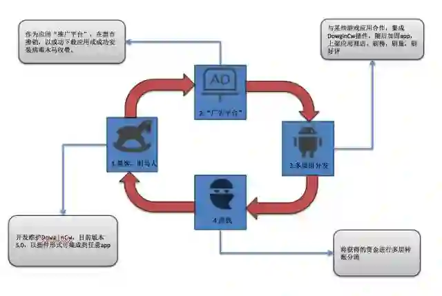 如下图所示,由制马人、广告平台、多渠道分发、转账洗钱构成了“DowginCw”黑色产业链的关键环节。