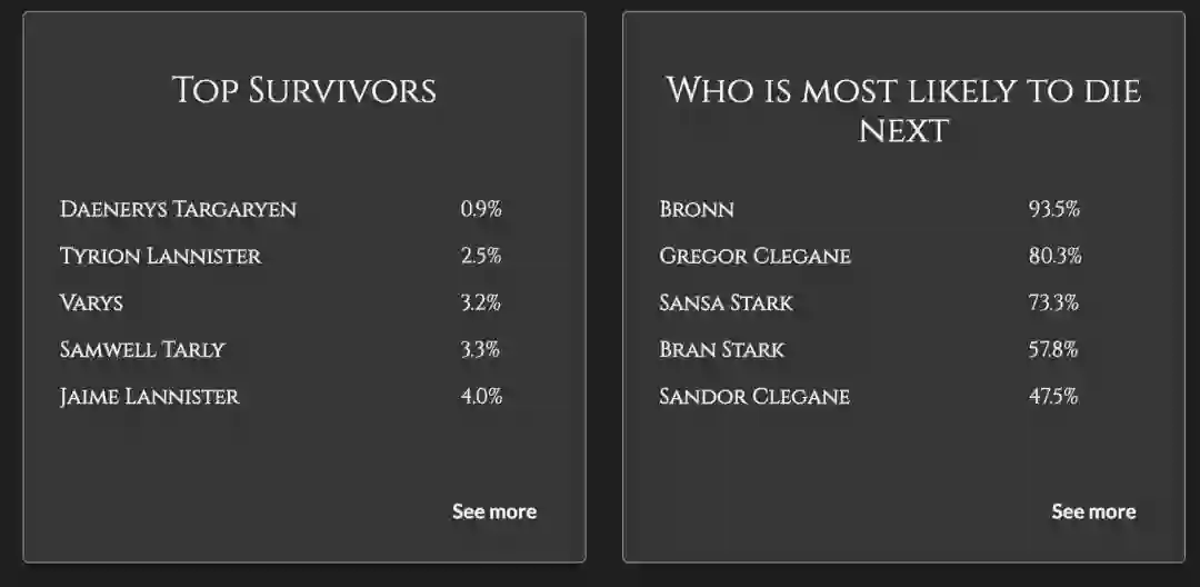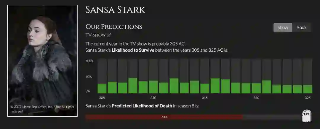 除了死亡率可能性最高的波隆和魔山,这个被七大王国最聪明的男人(Tyrion Lannister)预言最长命的 “三傻”(Sansa Stark),她的死期也被预测的明明白白,死亡率高达73%。