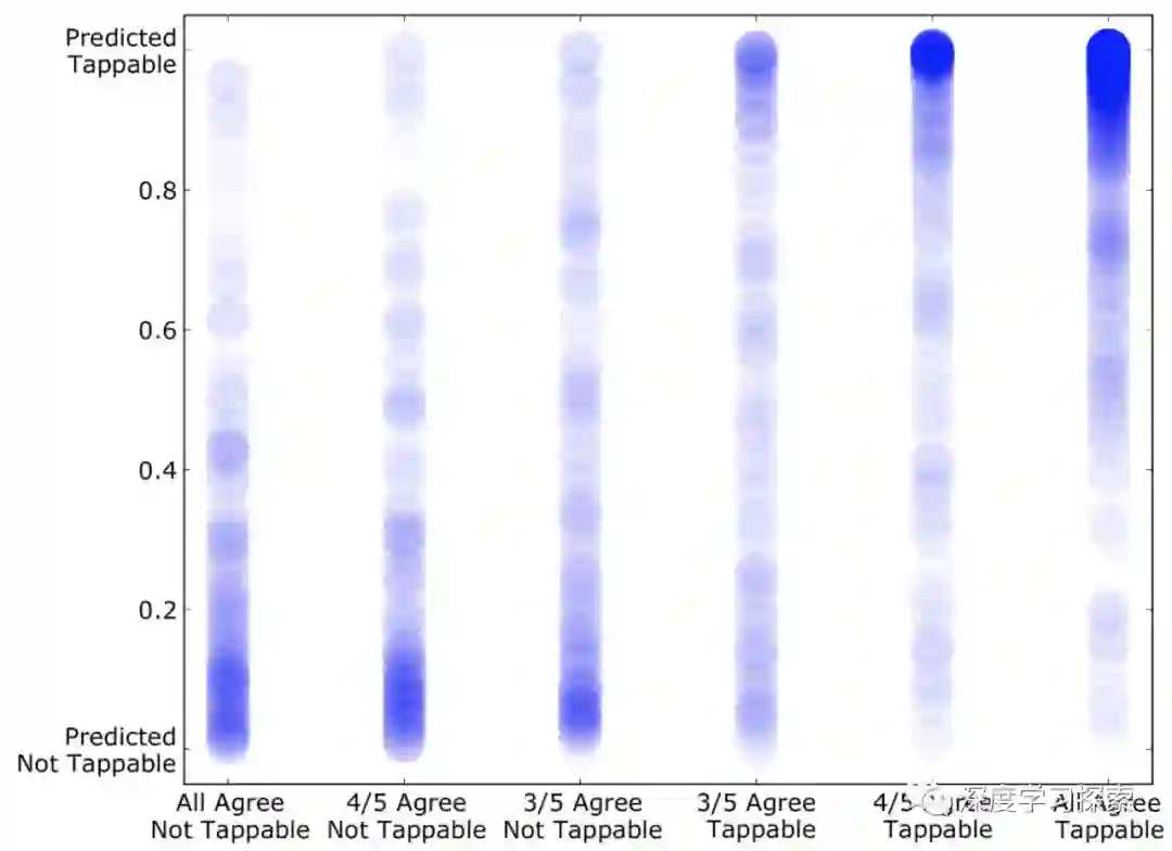 当用户同意元素的可适用性时,我们的模型倾向于给出更明确的答案 - 对于tappable而言接近1的概率和对于不可点击的接近0的概率。当工人在一个元素上不一致(朝向X轴的中间)时,我们的模型对决策也不太确定。总的来说,我们的模型在识别可触摸UI元素时达到了人类感知匹配的合理准确度,平均精度为90.2%,召回率为87.0%。