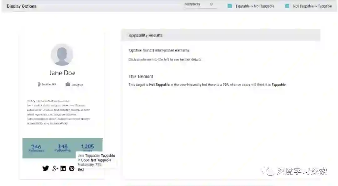 该模型允许我们自动诊断由我们的模型预测的用户所感知的每个界面元素的可触发性与开发者或设计者指定的元素的预期或实际可点击状态之间的不匹配。在下面的示例中,我们的模型预测用户会有73%的可能性认为诸如“Followers”或“Following”之类的标签是可插拔的,而这些界面元素实际上并未被编程为可点击的。