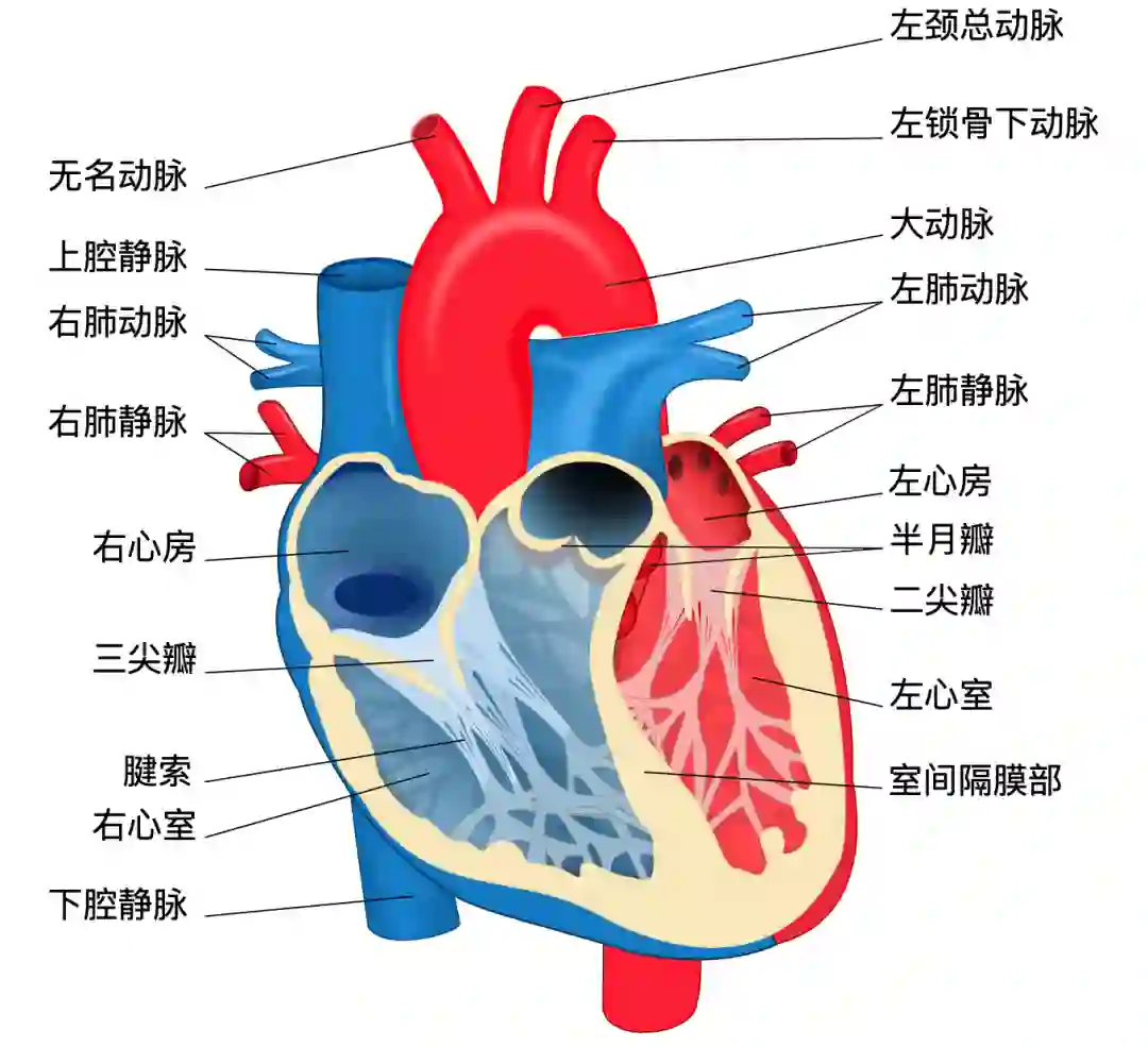 图|人类心脏各部分名称。(来源:维基百科)