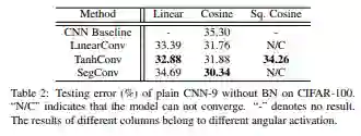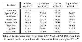 注意,这个表格当中,每一行都是一个 卷积操作子也就是 h(.)Norm函数,每一列都是一个 角度激活函数g(.)。因此,如之前所说,对于一个一般CNN 就是g(.)=Cosine。