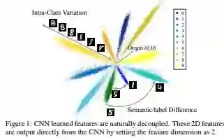 这张图是 CNN在手写体识别任务上学到的特征的2D可视化示意图。 0~9每一个手写体数字对应的特征是图中的一束;任意一束当中的不同位置表示的是同一类别的不同表征,也就是类间差距(intra-class Variations);束与束之间形成的夹角表达的是两个类别之间的差距(inter-class difference),也就是这里所谓的语义差异。