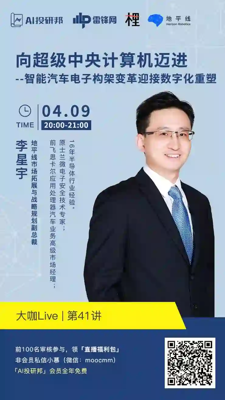 「大咖Live」第41讲,2019年4月9日(下周二)20:00,地平线市场拓展与战略规划副总裁李星宇将带来关于《向超级中央计算机迈进--智能汽车电子构架变革迎接数字化重塑》的主题分享,详解智能汽车电子架构变革的行业趋势,分享地平线在自动驾驶处理器方面的研发和落地应用经验