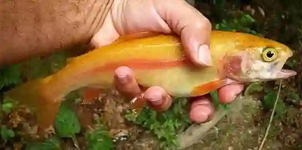 国内还经常出现一种叫“金鳟”的虹鳟个体,其实那是经过人工选育扩大养殖的白化虹鳟。体色为鲜亮的金黄色,成鱼体侧有红色或粉色纵带。