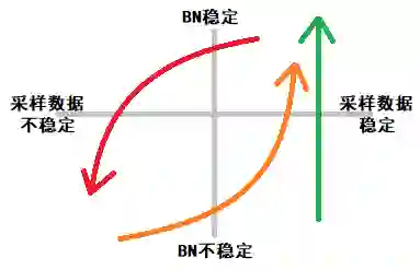 在训练数据稳定时,BN也会趋于稳定,并算出稳定的均值和方差(绿色箭头终点)