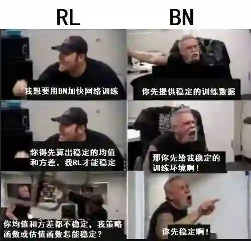 在强化学习中,BN会失效,智能体 (agent) 训练越快,BN越难以发挥作用。与有监督训练不同,RL的智能体需要通过「经验回放」技术与环境交互来获取训练数据,这些数据不是一开始就准备好的。所以RL无法为BN提供足够稳定的训练数据,每当训练数据发生变化(智能体搜集到大量新的状态state),而BN来不及适应新的数据,造成估值函数和策略函数相继奔溃(表现为估值函数的估值不准,策略函数的策略退化)。